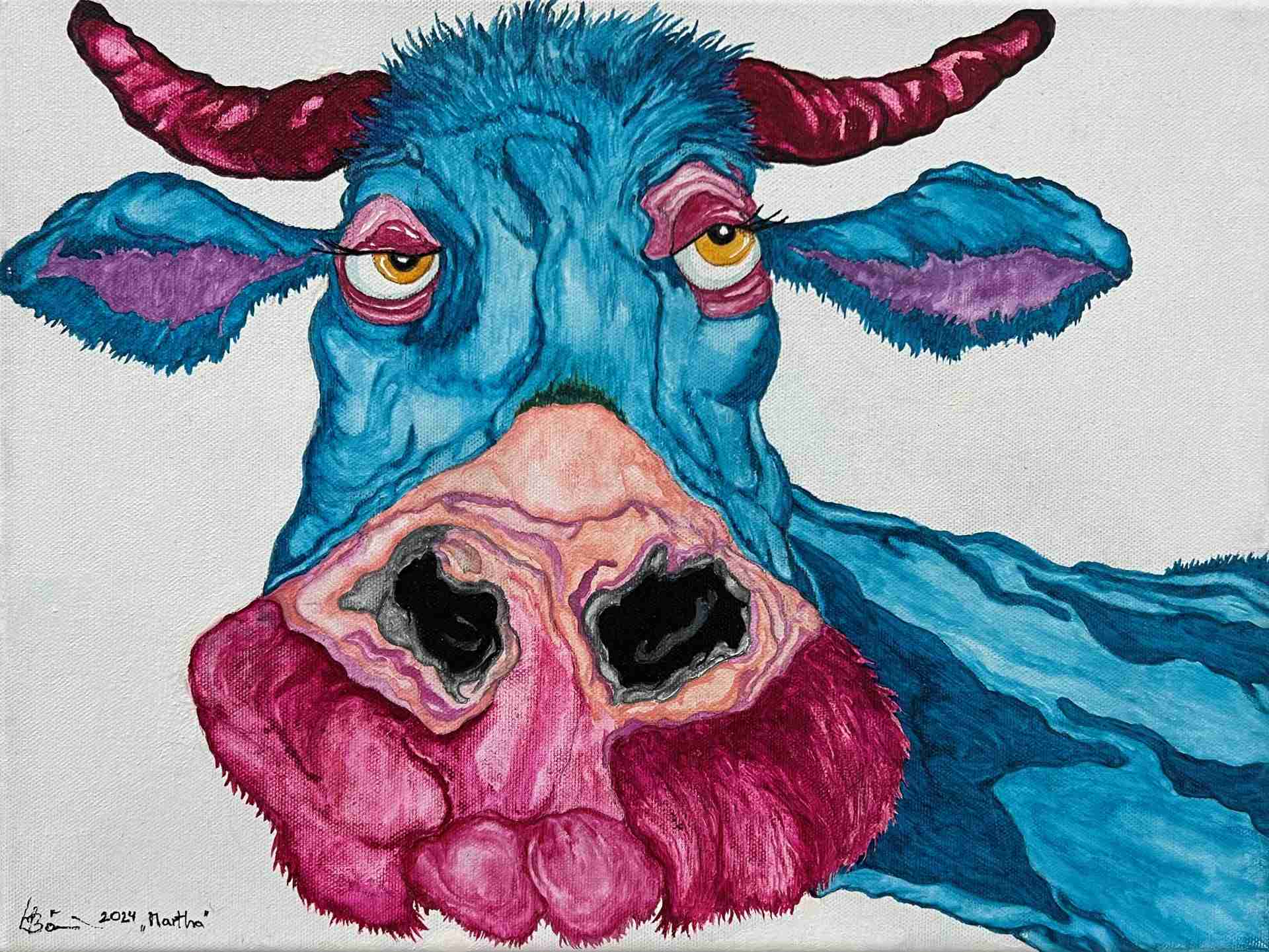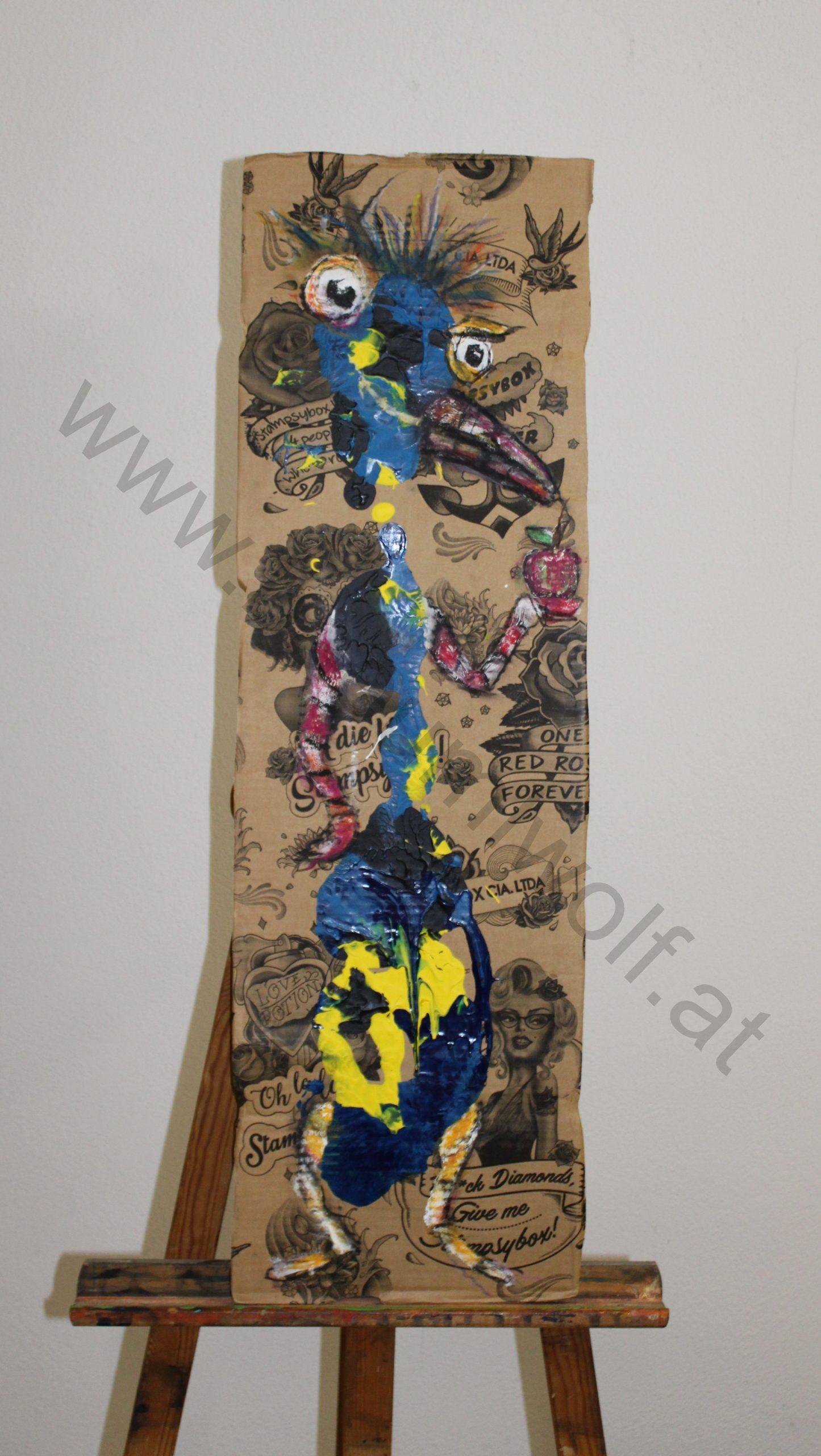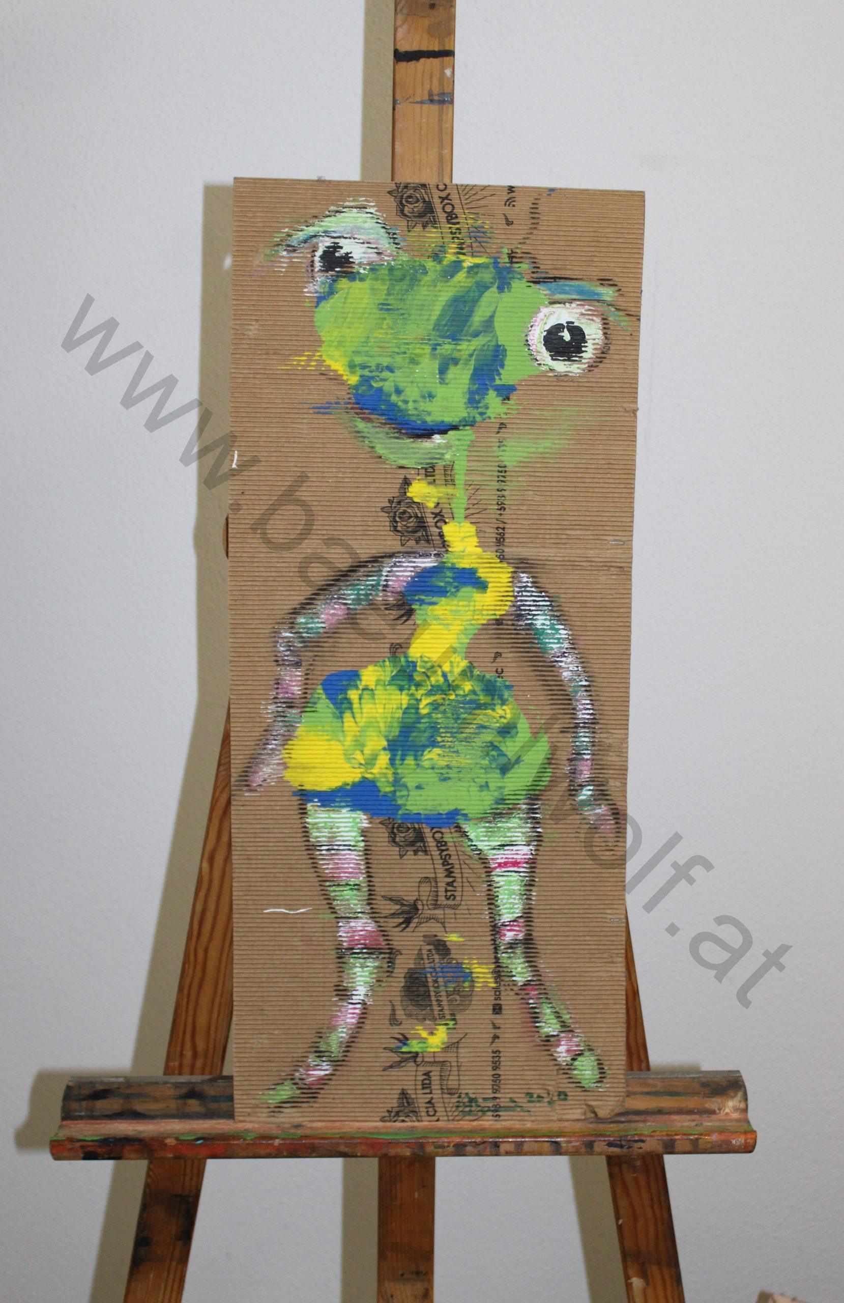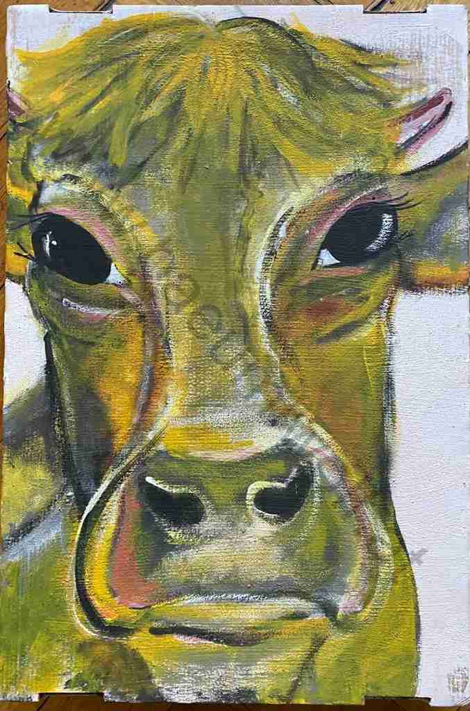Mein Hauptaugenmerk liegt seit ca. 20 Jahren beim „lieben Vieh“, dabei arbeite ich abhängig von Phasen in Mischtechniken mit Acryl, Ölkreide und Aquarell. Ebenfalls greife ich immer wieder als Untergründe Recycling Material auf, zu dem auch Collagen entstehen!