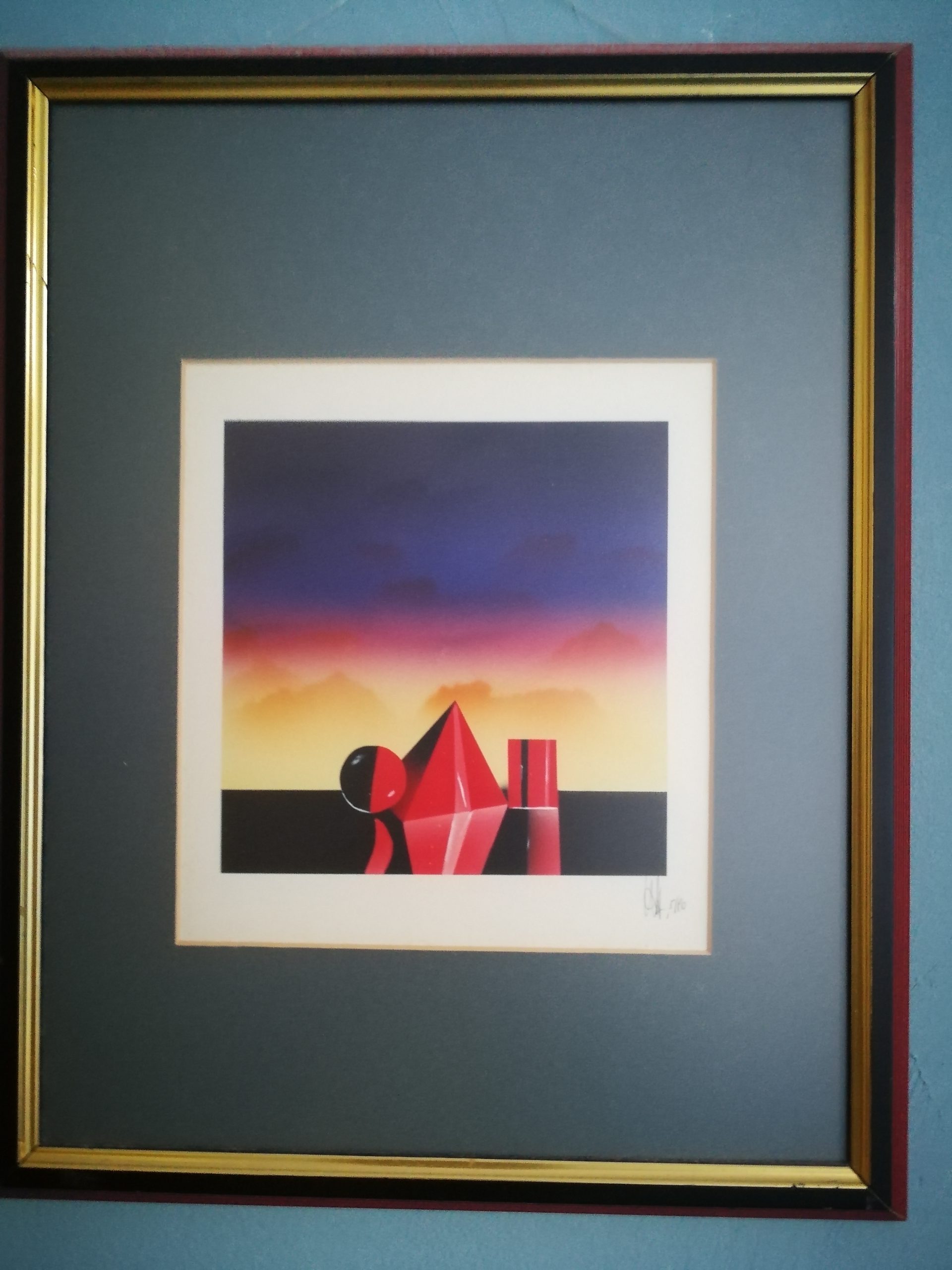 Elements stellt er drei geometrische Figuren in Lackrot in den Mittelpunkt der Komposition und kontrastiert ihre Strenge und die scharfe Farbe, die sie vom luftigeren, schattierten Hintergrund unterscheidet, als ob er auf irgendeine Weise die Verbundenheit mit allem, was ist, betonen wollte starr, gegenüber allem, was schematischen Regeln unterliegt, ist in Wirklichkeit nur ein scheinbarer Halt, ein Verlangen, an Gewissheiten festzuhalten, die in der äußeren Wirklichkeit nicht existieren; D ie Volatilität des Himmels sagt dem Betrachter, dass Chaos ein anmaßender und ständiger Bestandteil des Alltags ist, die Karten mischt und die Ordnung, an die sich der Einzelne klammert, unterwandert, um nicht destabilisiert zu werden.